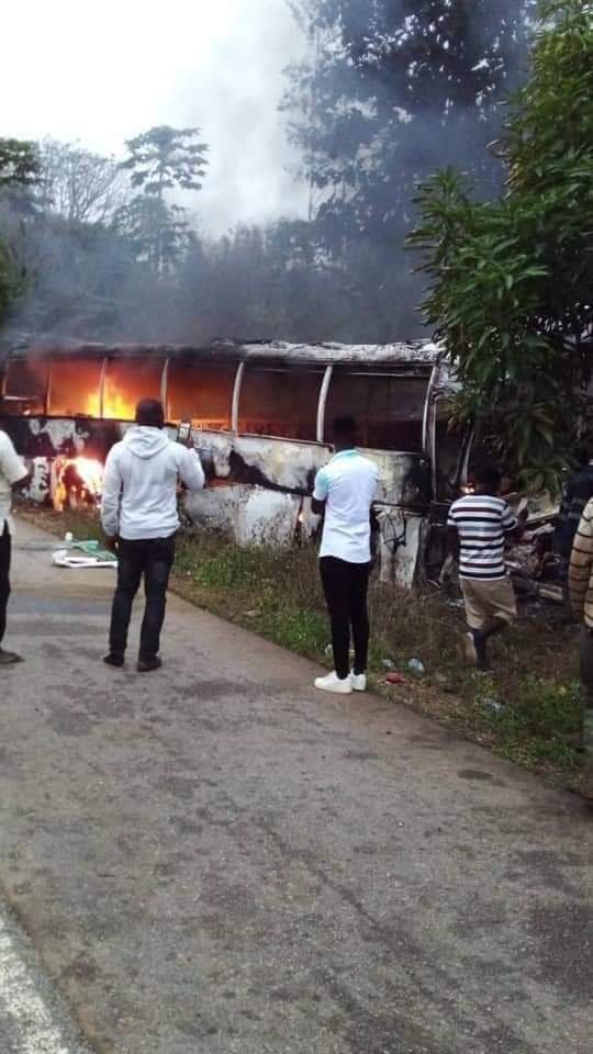 The bus with a registration number GP 4215-17 aboard passengers from Nandom to Kumasi went in flames after it crashed into a Kia Rhino towing vehicle with a registration number GB 6983-12 which had been parked on the roadside.